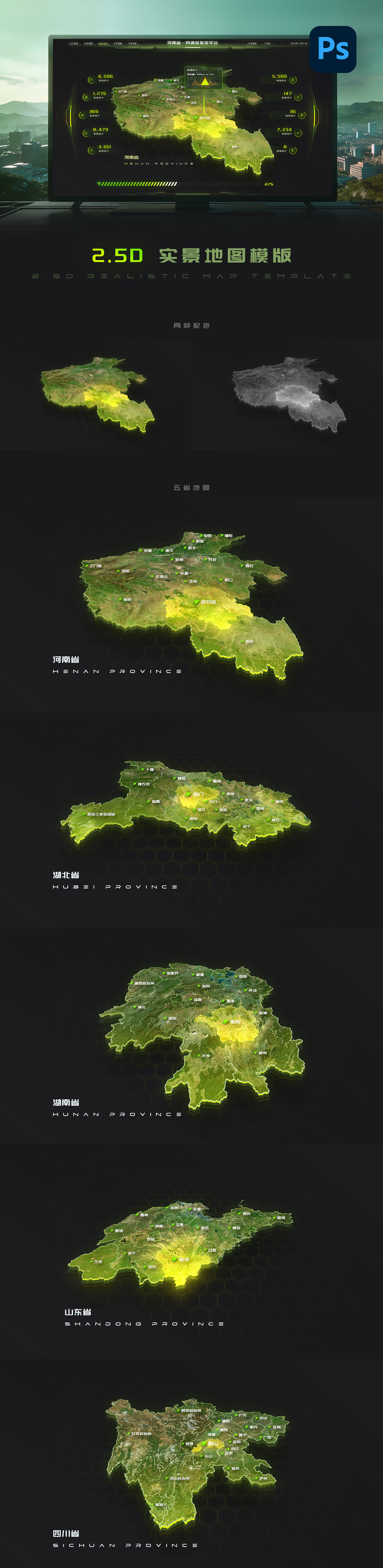 河南、湖北、湖南、山东、四川,共5个省的地图 + 1个大屏模板,地图有绿色和黑白2种配色一共11个PSD文件。该素材已经加入《佐忍可视化组件库(PSD版本)》请不要重复购买。原创作品,盗版必究。虚拟产品一经售出,概不退换